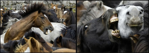 Two horses fight during the "Rapa Das Bestas" traditional event in the Spanish northwestern village of Sabucedo July 2, 2011. On the first weekend of the month of July, hundreds of wild horses are rounded up, trimmed and groomed in different villages in Spain's northwestern region of Galicia.